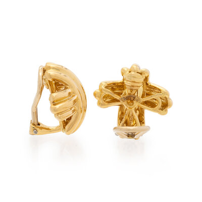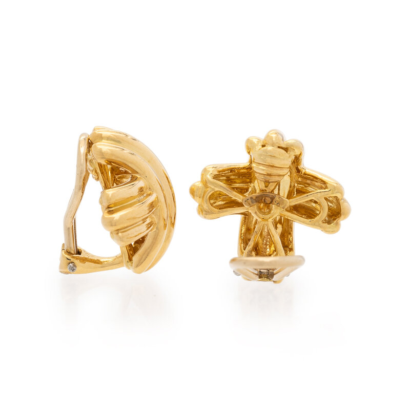 In a ridged 'X' motif. 18 karat yellow gold. 3/4 inch long.