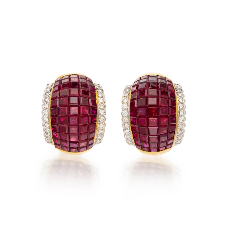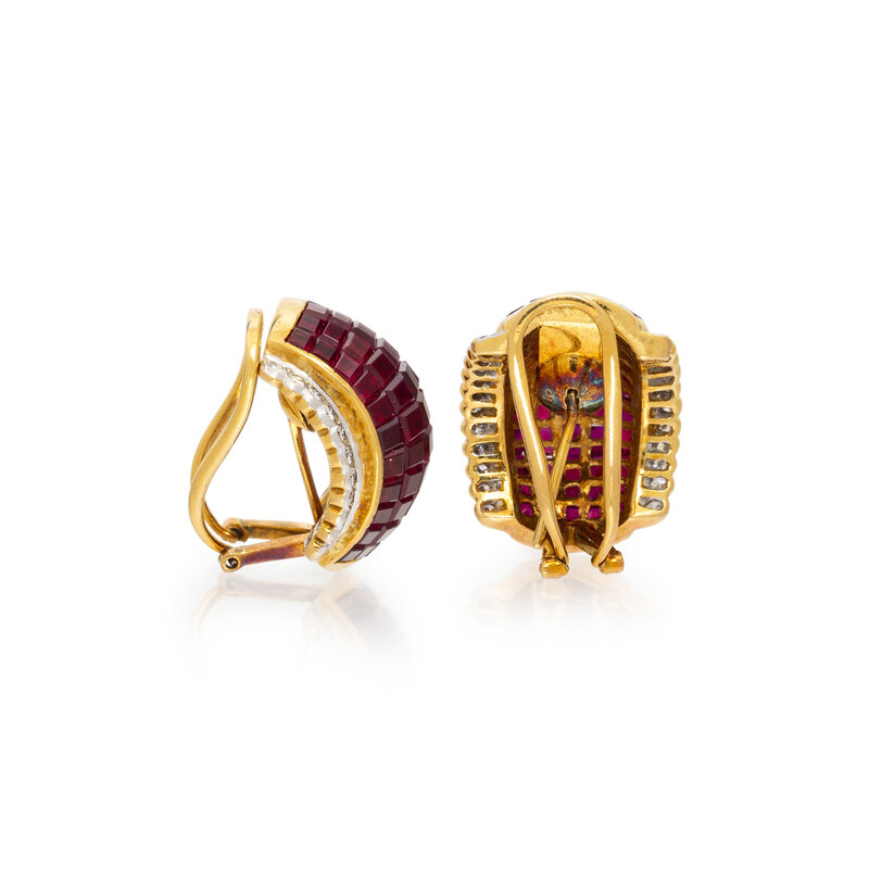 In a half-hoop design featuring invisibly set rubies and round diamonds weighing approximately 0.65 carat total. Mounted in yellow gold. 7/8 inch long.