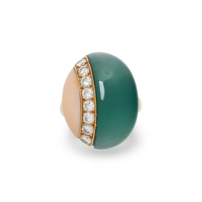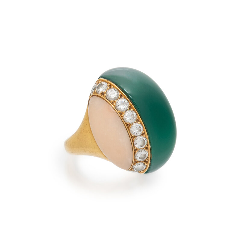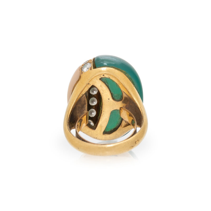 MAUBOUSSIN, CORAL, CHRYSOPRASE, AND DIAMOND RING