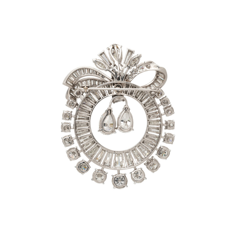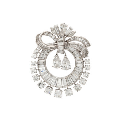 In a wreath design topped by a bow and suspending two pear shaped diamonds in the center weighing approximately 1.00 carat each, with numerous round, marquise, and baguette cut diamonds weighing approximately 12.00 - 14.00 carats total. Mounted in platinum. 2 1/4 x 1 3/4 inches.