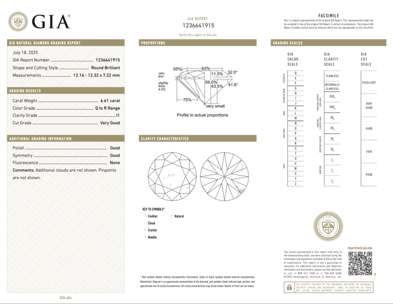 GIA, 2025, Report No. 1236641915, 6.61 carats, Q to R Range color, I1 clarity, No fluorescence