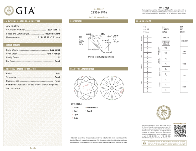GIA, 2025, Report No. 2235641916, 6.52 carats, Q to R Range color, I1 clarity, No fluorescence