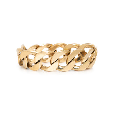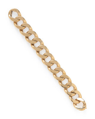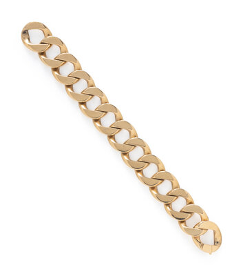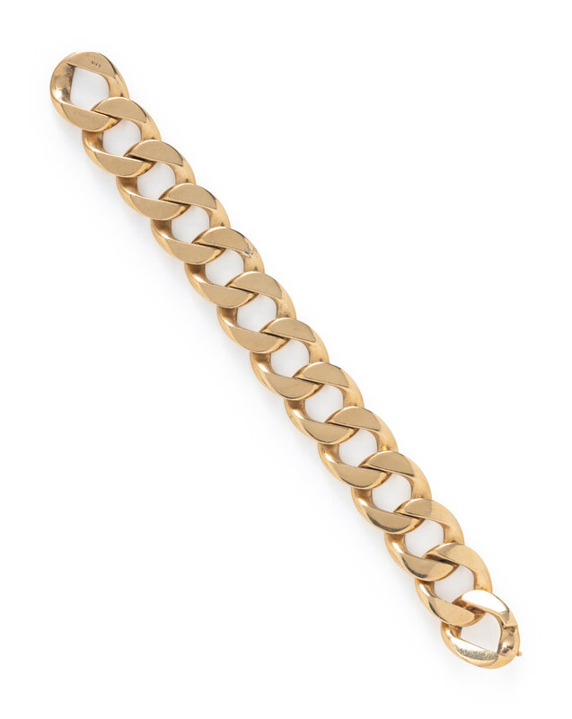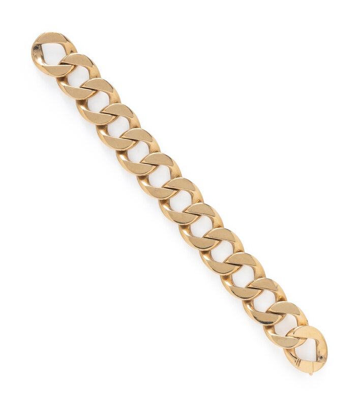 With curb links measuring approximately 20.00 mm wide. Mounted in 14 karat yellow gold. 7 1/2 inches long.