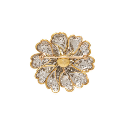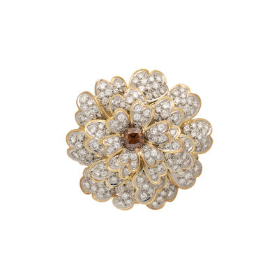 The center set with a cushion cut brown diamond (origin of color not tested) measuring approximately 6.25 x 3.15 mm, and radiating petals set with round diamonds weighing approximately 6.50 - 7.50 carats total. Mounted in 18 karat yellow gold and platinum. 1 3/4 inches wide.