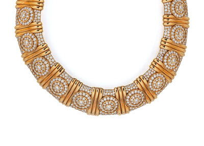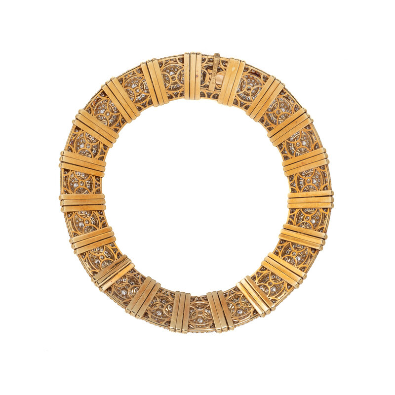 In a geometric design, with diamond-set concentric circles separated by curved gold links, set throughout with round diamonds weighing approximately 32.00 - 34.00 carats total. Mounted in 18 karat yellow gold. 13 inches inner circumference, 1 inch wide.
