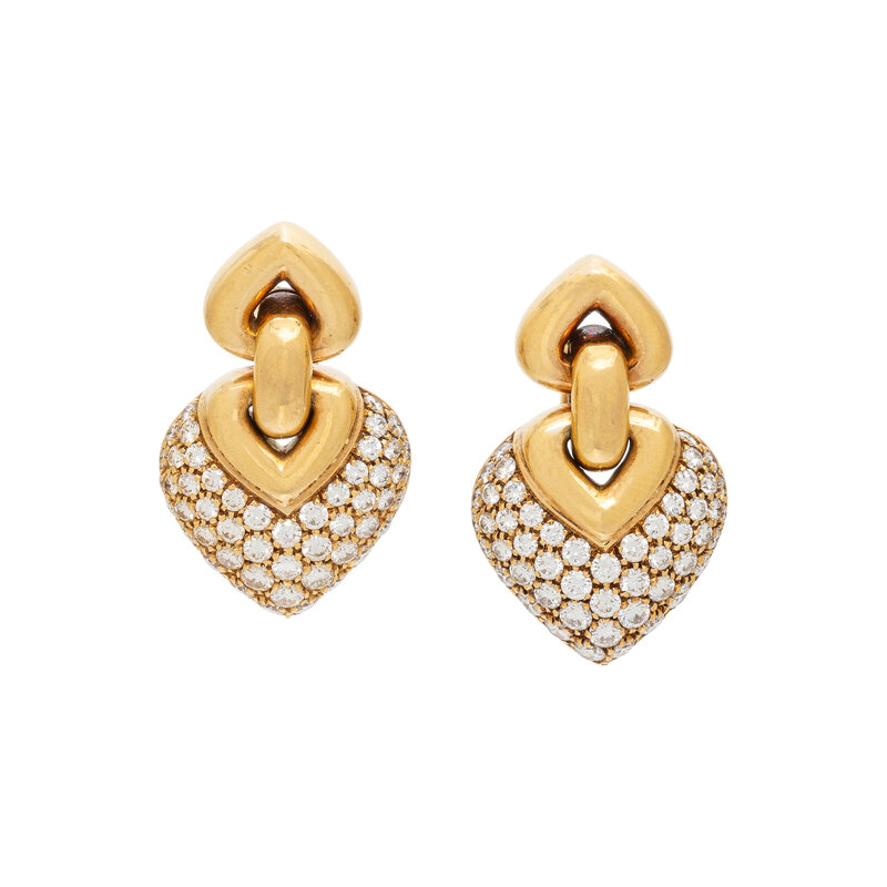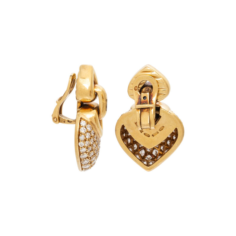 In a heart motif articulated door-knocker style, set with round diamonds weighing approximately 4.00-4.50 carats total. 18 karat yellow gold. 1 1/4 inches long.