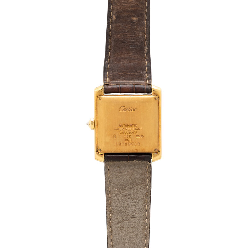 Stamps: Case back: Cartier AUTOMATIC WATER RESISTANT SWISS MADE 18K 1840 101800CD (Swiss hallmark).