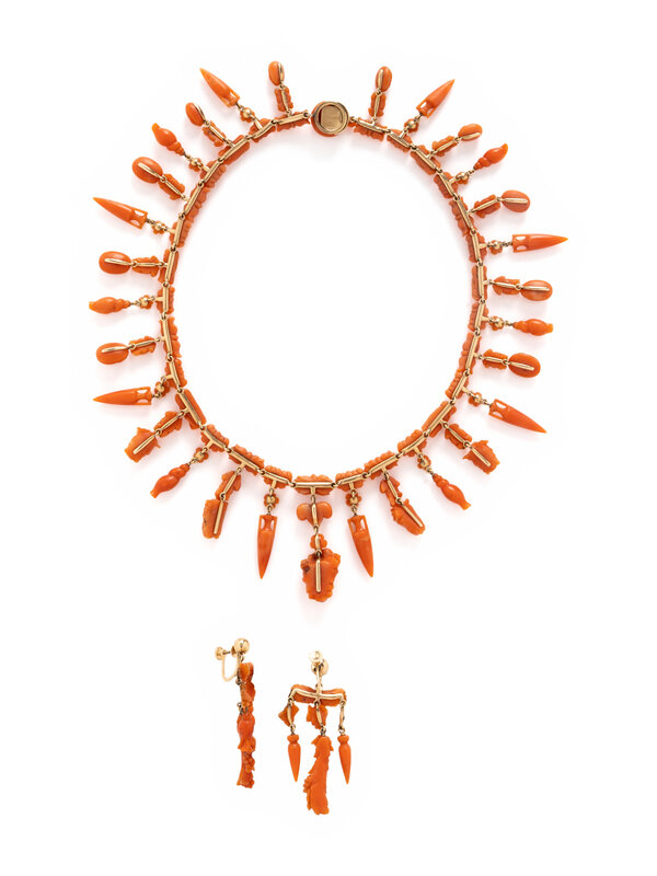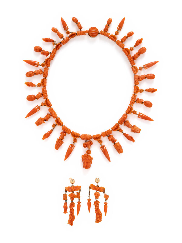 Including a necklace and earrings, set throughout with numerous carved coral depicting various Grecian motifs. Mounted in yellow gold. Earrings: 2 1/8 inches long. Necklace: 14 3/4 inches long.
