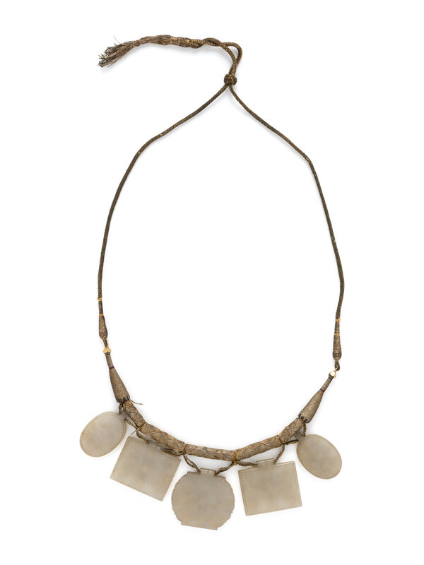 Featuring a swag of five carved rectangular, oval, and fancy shaped jade plaques inlaid with yellow gold and variously shaped gemstones, including cultured pearl, ruby, turquoise, chalcedony, sapphire, emerald, pearl, citrine, tourmaline, and rose cut diamonds. On a textile cord. 22 1/2 inches long.