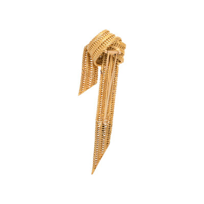 Designed in a partially flexible mesh knot. Mounted in 18 karat yellow gold. 3 x 1 inches.