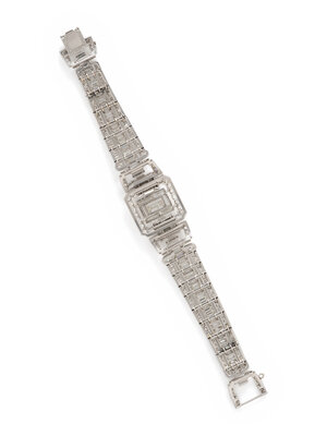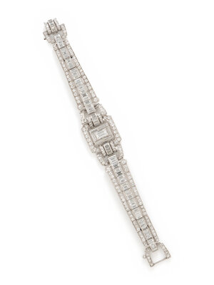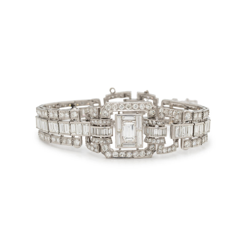 In a geometric design, featuring a rectangular step cut diamond weighing approximately 1.20 carats, with numerous baguette, single, and transitional cut diamonds set throughout weighing approximately 16.00 - 18.00 carats total. Mounted in platinum. 6 7/8 inches long.