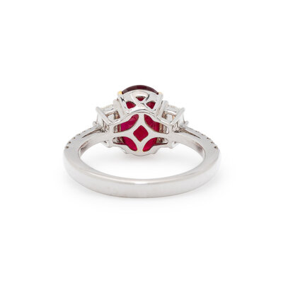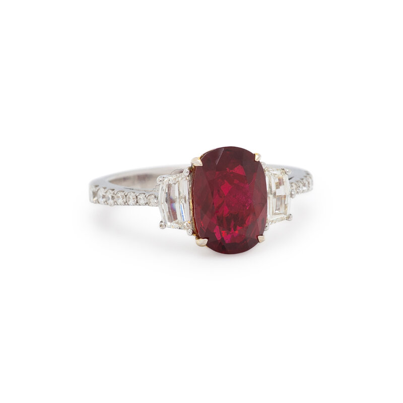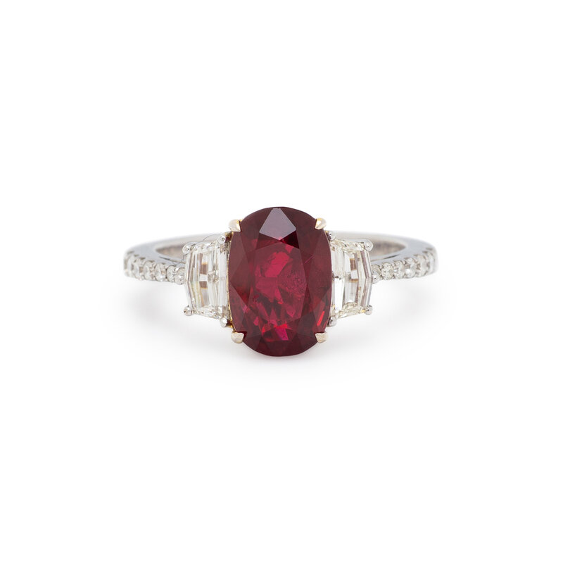 Featuring an oval ruby weighing 3.17 carats, flanked by two pentagonal diamonds weighing approximately 0.45 carat total, with further round diamonds set in the shank. Mounted in 18 karat white gold. Ring size 6 3/4.