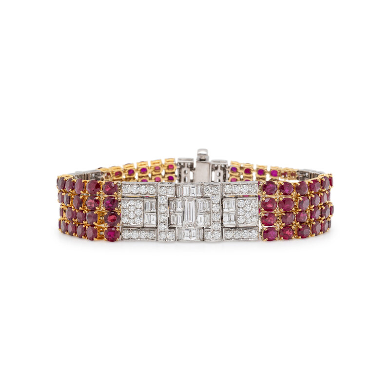 In flexible links, set with round Burmese rubies weighing approximately 26.00 carats total, separated by links set with round and baguette cut diamonds weighing approximately 7.00 - 8.00 carats total. Mounted in 18 karat yellow and white gold. 6 7/8 inches long.
