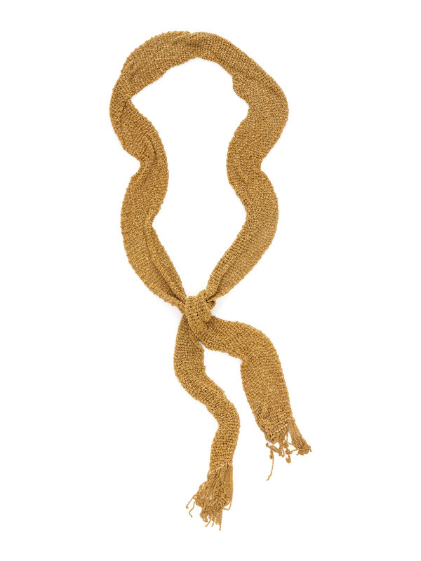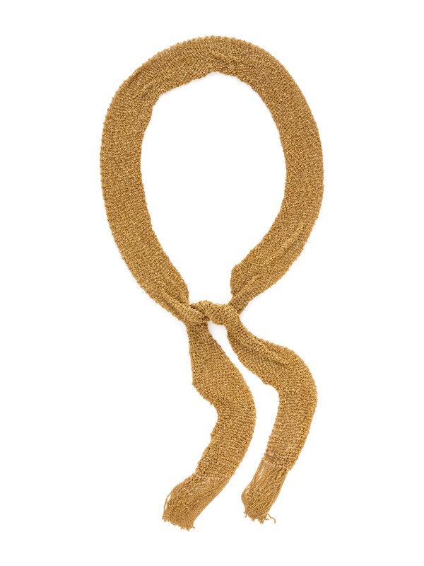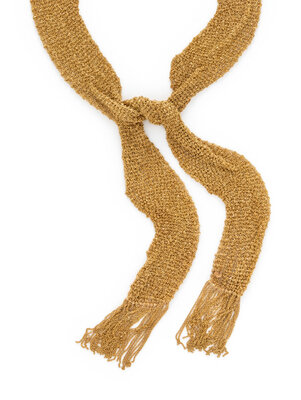 In a delicate gold mesh ended by a row of fringe on each side. Mounted in 18 karat yellow gold. 35 inches long.