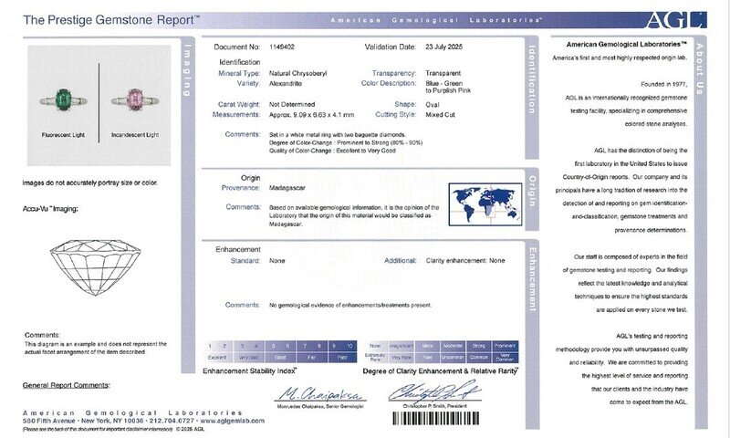 AGL, 2025, Report No. 1149402, Natural Chrysoberyl, Alexandrite, Madagascar, No gemological evidence of enhancements/treatments present