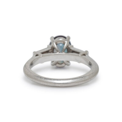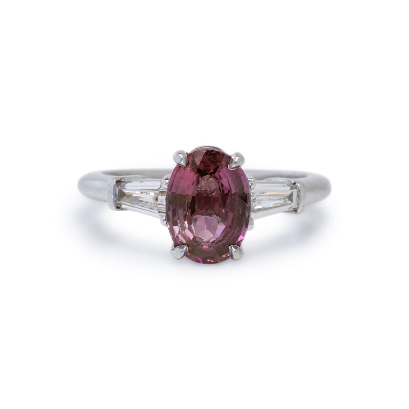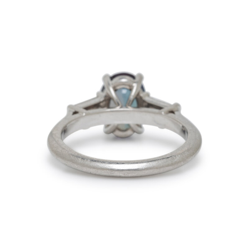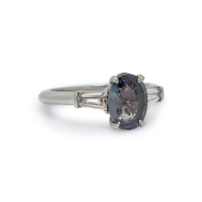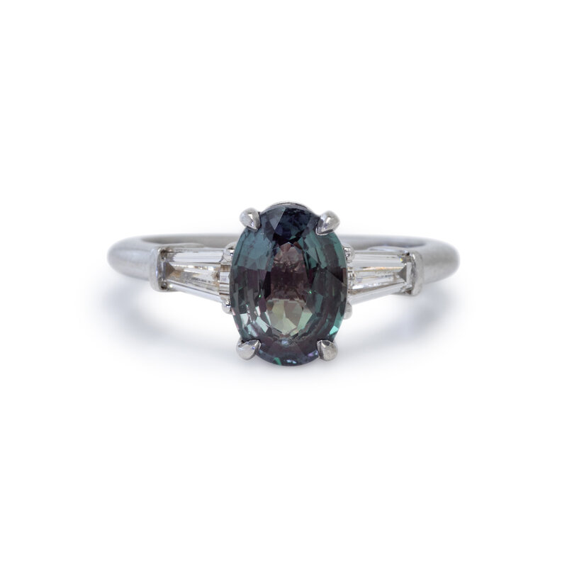 Featuring an oval alexandrite weighing approximately 2.10 carats by formula, flanked by two tapered baguette cut diamonds weighing approximately 0.40 carat total. Mounted in platinum. Ring size 5 1/2.