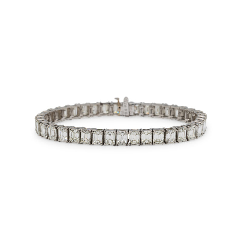 Set with 39 emerald cut diamonds weighing approximately 20.00 - 21.00 carats total. Mounted in platinum. 7 inches long.