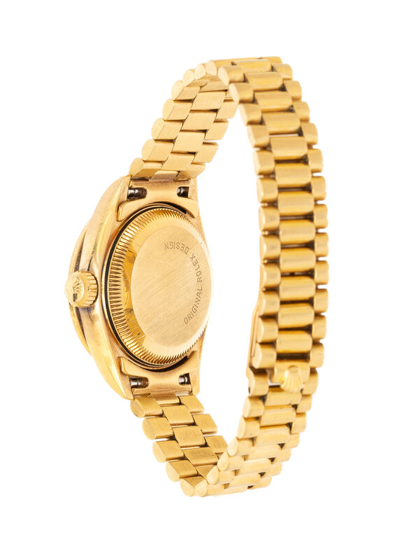 Stamps: Case back: ORIGINAL ROLEX DESIGN. Clasp: ROLEX 8570F GENEVE ROLEXSA 750 SWISS MADE 18K (Swiss hallmarks).