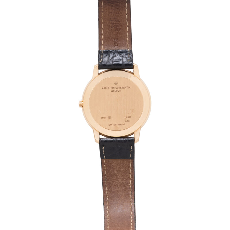 Stamps: Case back: VACHERON CONSTANTIN GENEVE 81180 1261919 (Swiss hallmarks) 750 SWISS MADE. Buckle: 050063 (maker's marks) UNROC (Swiss hallmarks) 750.