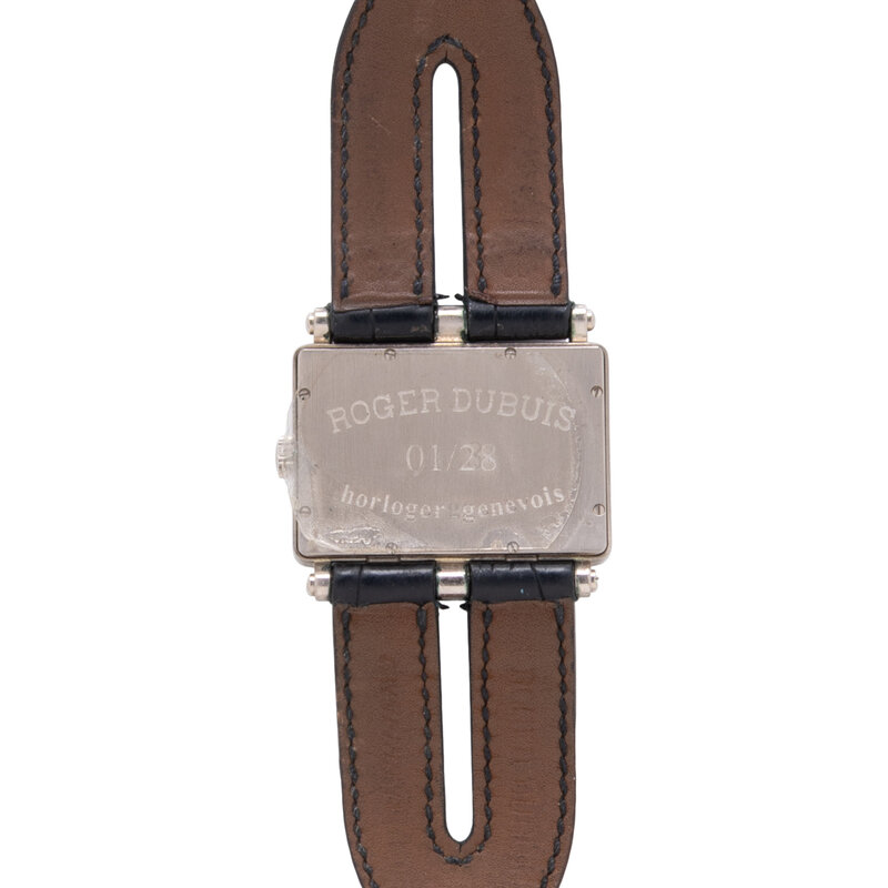 Stamps: Case: ROGER DUBUIS 01/28 horloger genevois 750 (maker's mark)(Swiss hallmarks). Case interior: ROGER DUBUIS T26180 18K750 204914 MOUV. No 1267 SERIE. No (Swiss hallmarks). Movement: SWISS ADJ. FIVE (5) POS. No. 1267 TWENTY (20) JEWELS GENEVA CAL. RD18 ROGER DUBUIS. Buckle: ROGER DUBUIS 750 (maker's mark).