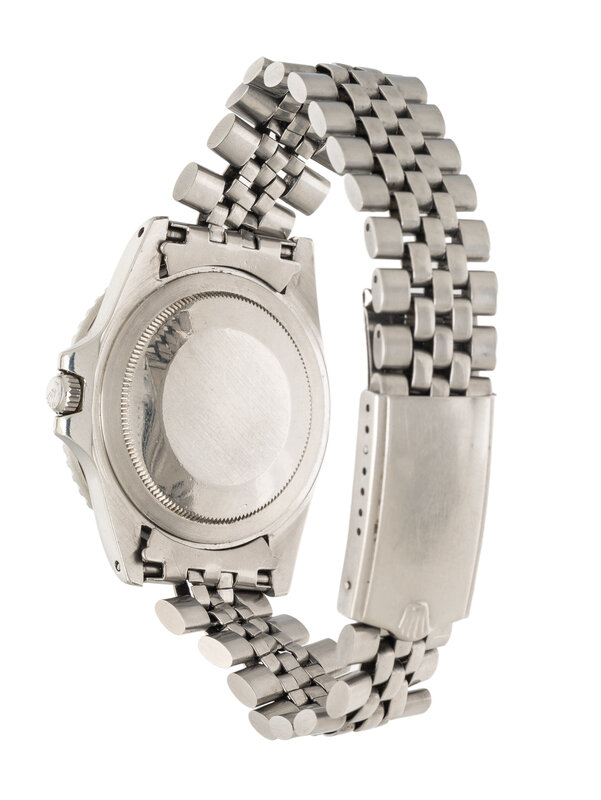 Stamps: Case: REGISTERED DESIGN 1675 1870717. Case interior: MONTRES ROLEX SA GENEVA SWITZERLAND PATENTED STAINLESS STEEL 1675 IV67. Movement: MONTRES ROLEX SA TWENTY SIX JEWELS GENEVA 1570. Bracelet: ROLEX STAINLESS STEEL U.S.A.