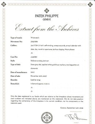 Sold with: Inner and outer box, Patek Philippe leather folio, instruction manuals, and Extract from the Archives
