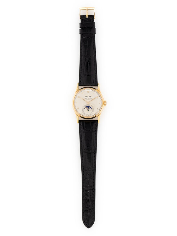 Bracelet/Strap: Patek Philippe black leather strap with 18K yellow gold Patek Philippe buckle