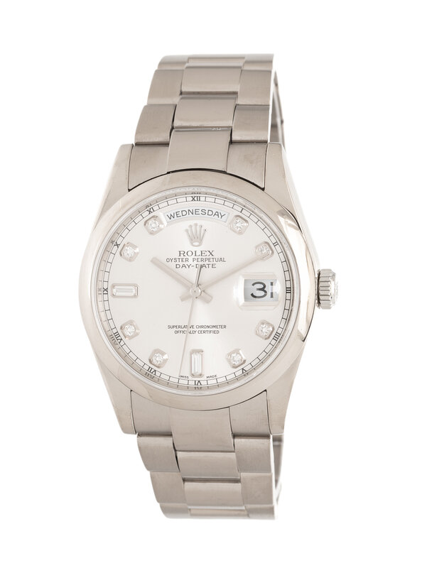 ROLEX, REF. 118209 18K WHITE GOLD 'DAY-DATE' WATCH WITH FACTORY DIAMOND DIAL, BOX & BOOKLETS