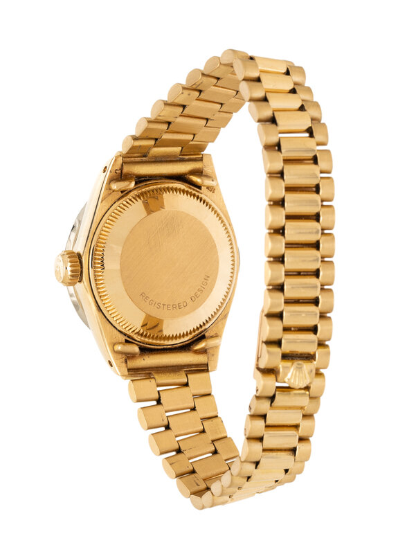 Stamps: Case back: REGISTERED DESIGN. Case: 18K (Swiss hallmark) 6917 750 5964638. Clasp: ROLEX GENEVE ROLEXSA 750 SWISS MADE (Swiss hallmarks) 18K.