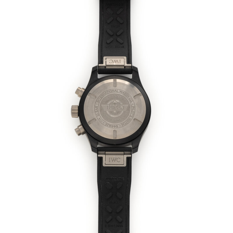 Stamps: Case back: TOP GUN UNITED STATES NAVY FIGHTER WEAPONS SCHOOL INTERNATIONAL WATCH CO. PILOT'S WATCH 6441625 10 BAR. Strap: IWC SWISS MADE IEAL E0HLNW BA. Buckle: IWC DHEH TI SWISS.