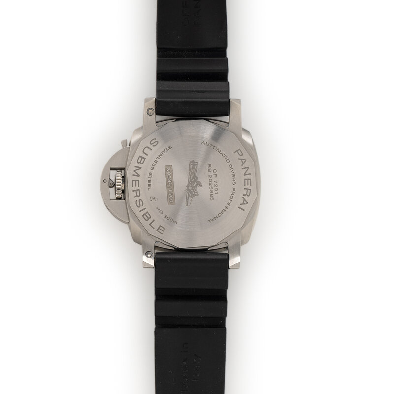 Stamps: Case back: PANERAI AUTOMATIC DIVERS PROFESSIONAL OP 7291 BB2025885 X0984/1500 STAINLESS STEEL 300m SUBMERSIBLE. Buckle: PRAF PANERAI.