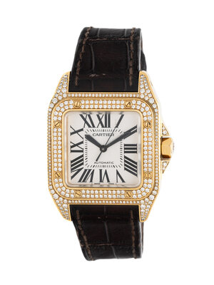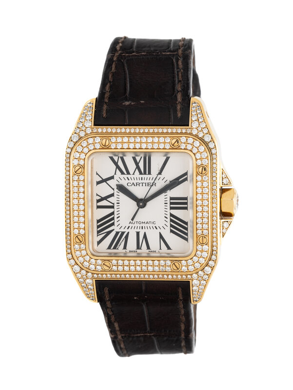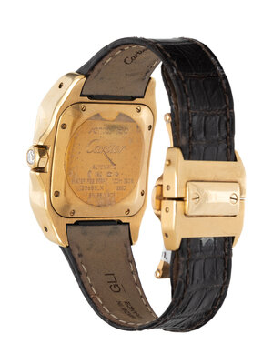 Stamps: Case back: santos 100 Cartier AUTOMATIC 750 (Swiss hallmarks) WATER RESISTANT 100m 330ft 123685LX 2880 SWISS MADE. Clasp: Cartier SWISS MADE 750 (Swiss hallmarks).