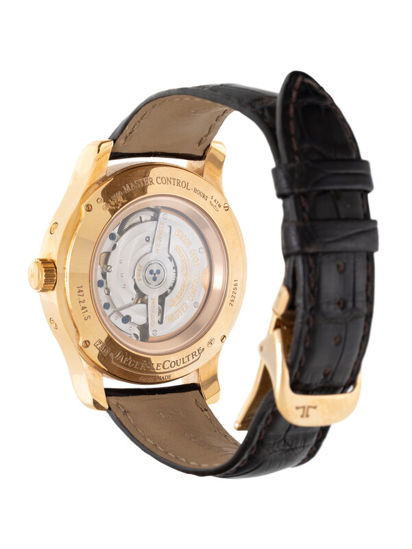 Stamps: Case back: (Swiss hallmarks) 1000-MASTER CONTROL -HOURS 5ATM 2522551 JAEGER-LECOULTRE SWISS MADE 750 147.2.41.S. Movement: FORTY-ONE (41) JEWELS JAEGER-LECOULTRE MASTER CONTROL 1000 HOURS SWISS 22C. Clasp: (Swiss hallmarks)(maker's mark) 750 JAEGER-LECOULTRE SWISS MADE.