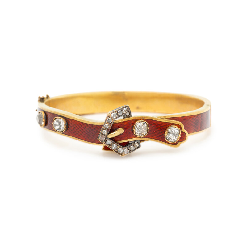 Designed as a buckle, set with old mine and rose cut diamonds weighing approximately 1.25 carats total, and red guilloché enamel, hinged with side clasp. Mounted in yellow gold, with the buckle element in silver-topped gold. 6 7/8 inner circumference.