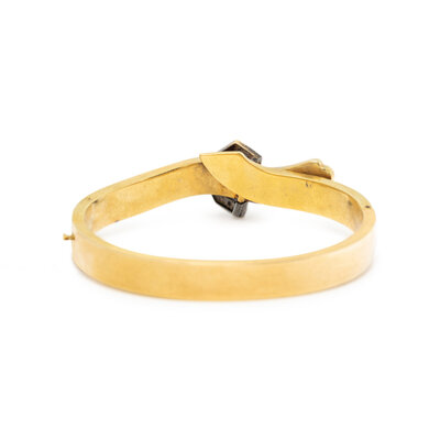 VICTORIAN, DIAMOND, ENAMEL, AND YELLOW GOLD BUCKLE BANGLE BRACELET