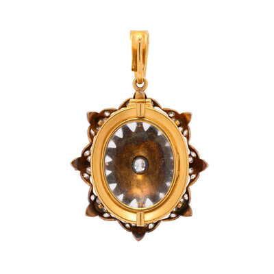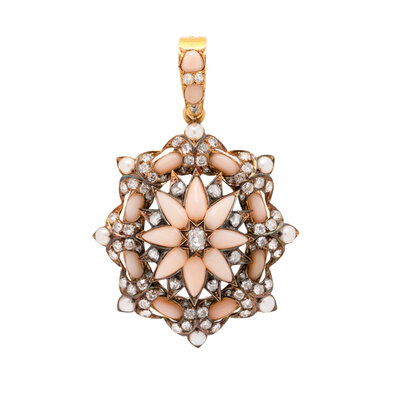 In a starburst design, set with angelskin coral, seed pearls, and old mine, old European, and antique cushion cut diamonds weighing approximately 2.25 - 2.75 carats total with additional rose cut diamonds, with a hinged glazed compartment on the reverse. Mounted in yellow gold. 2 3/8 x 1 1/2 inches.