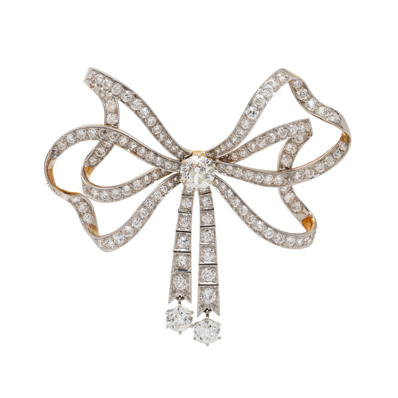 Designed as a bow with articulated dangling elements, set throughout with old European and old mine cut diamonds weighing approximately 10.75 - 11.25 carats by formula, including a central old mine cut diamond weighing approximately 1.55 carats by formula. Mounted in platinum-topped 18 karat yellow gold. 2 1/2 x 2 1/4 inches.