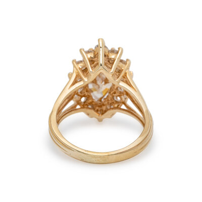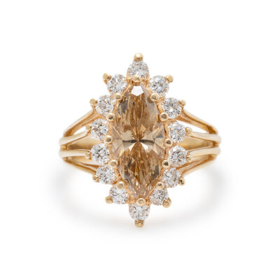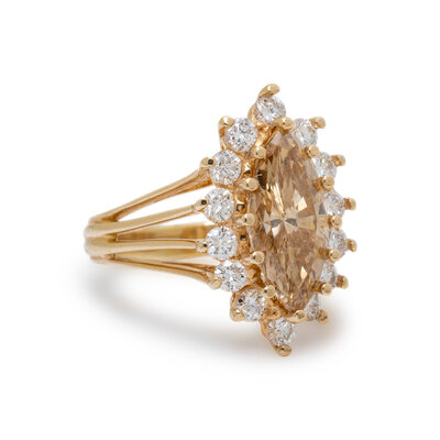 Featuring a marquise cut fancy brown-yellow diamond weighing 2.83 carats, framed by 14 round cut diamonds weighing approximately 0.95 carat total. Mounted in 14 karat yellow gold. Ring size 8.