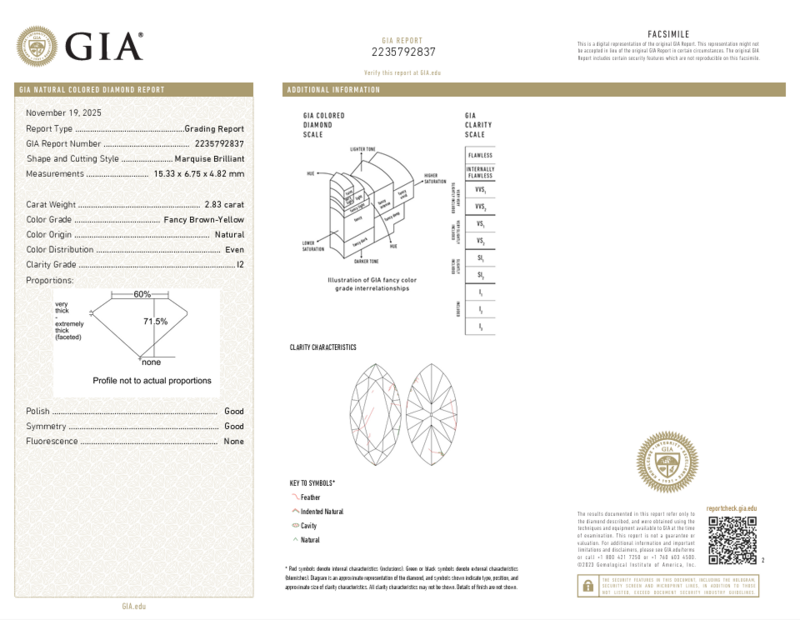GIA, 2025, Report No. 2235792837, 2.83 carats, Natural Fancy Brown-Yellow color, I2 clarity, No fluorescence