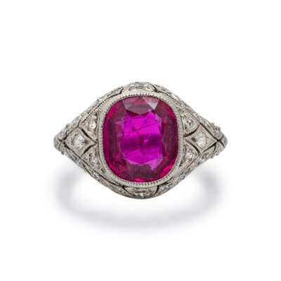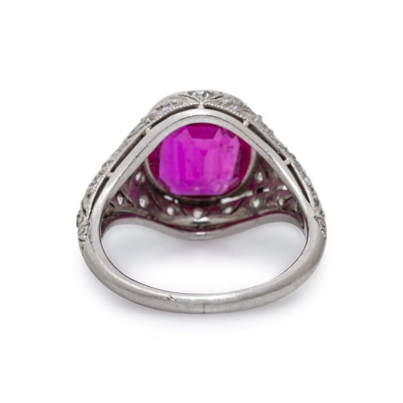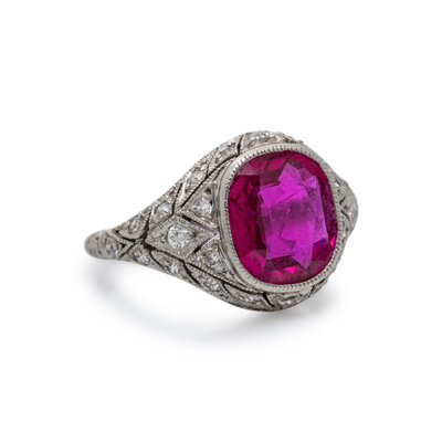 Featuring a cushion cut Burmese ruby with no evidence of heat treatment weighing approximately 2.00 carats, with round and single cut diamonds set throughout. Mounted in platinum. Ring size 3 1/2.