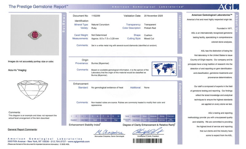 AGL, 2025, Report No. 1152259, Natural Corundum, Ruby, Burma (Myanmar), No gemological evidence of heat