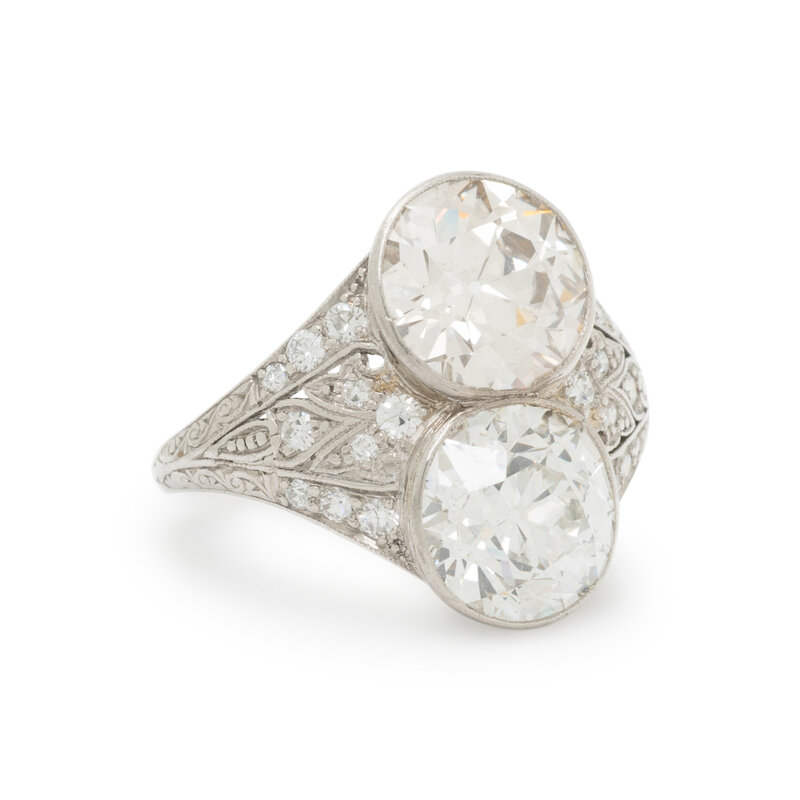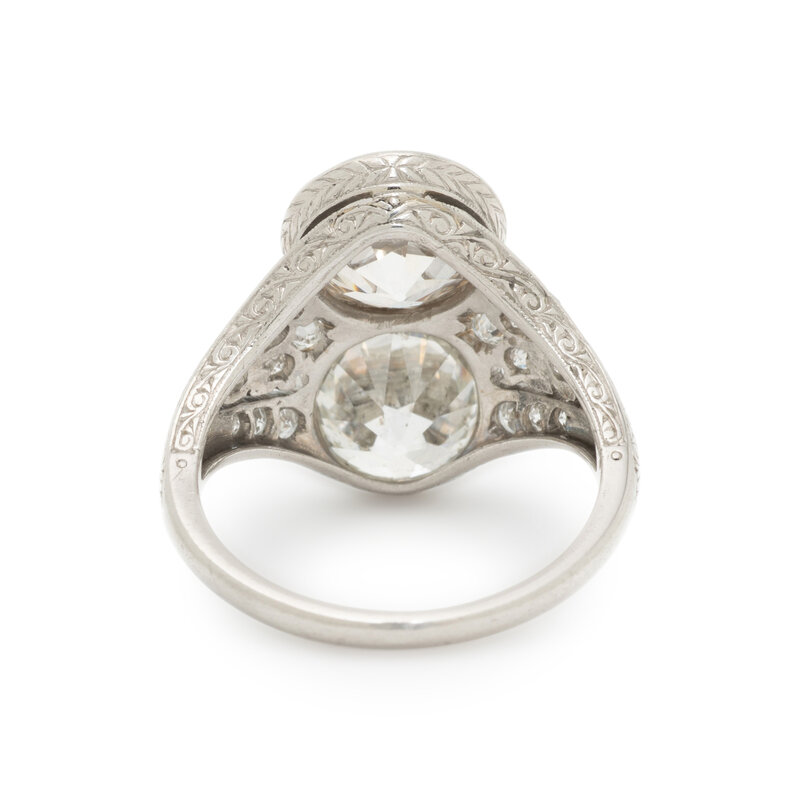 Featuring two old European cut diamonds weighing approximately 2.70 and 2.45 carats each, accented by round diamonds. Mounted in platinum. Ring size 5 1/4.