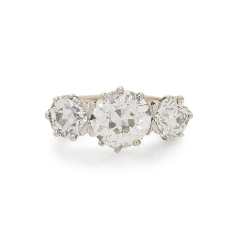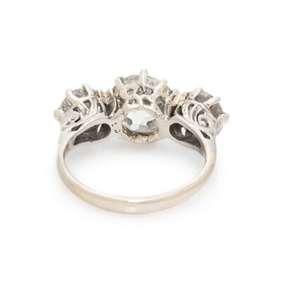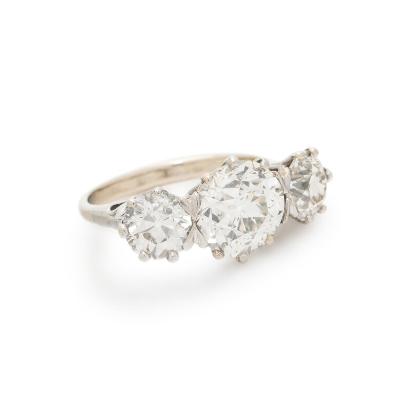 Featuring three old European cut diamonds, the center stone weighing approximately 2.50 carats and the flanking stones weighing approximately 1.55 carats total. Mounted in white gold. Ring size 4 1/4.