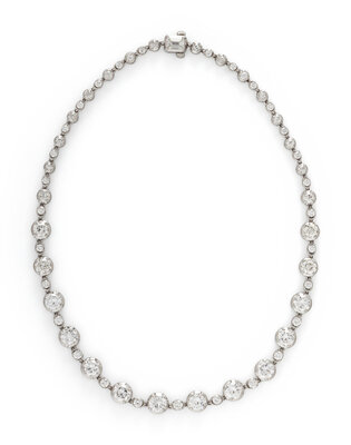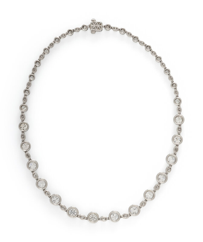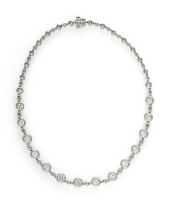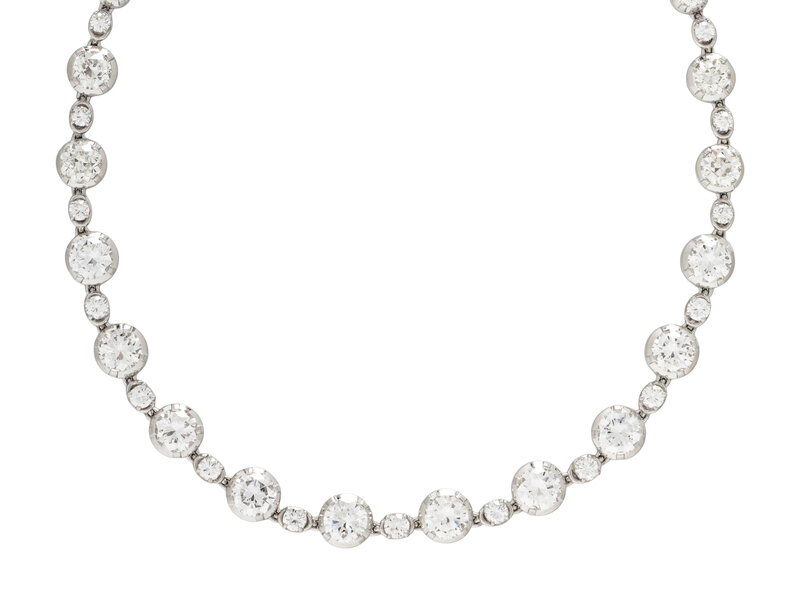 Designed with graduating bezel set round, transitional, and old European cut diamonds weighing approximately 18.00 carats total. Mounted in platinum. 15 1/2 inches long.