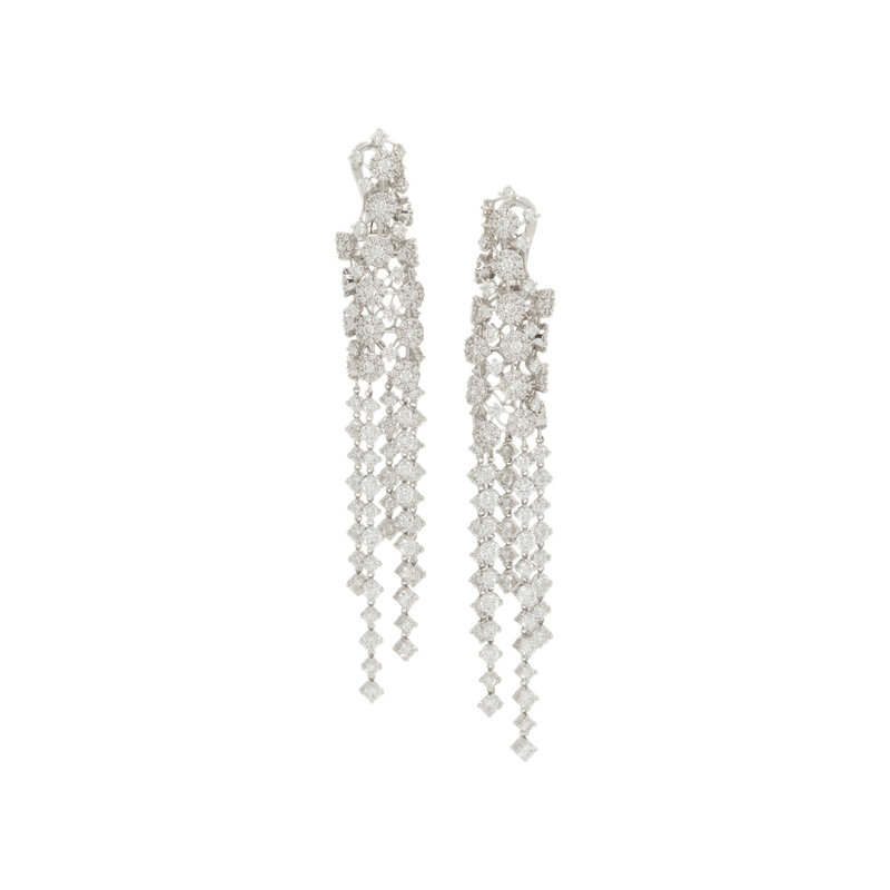 In a fringed design, diamond cluster tops suspending strands of round diamonds weighing approximately 11.10 carats total. Mounted in 18 karat white gold. 3 1/2 inches long.