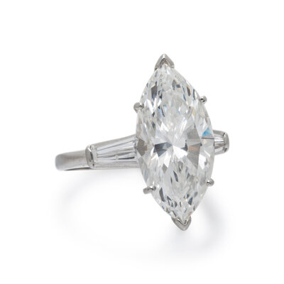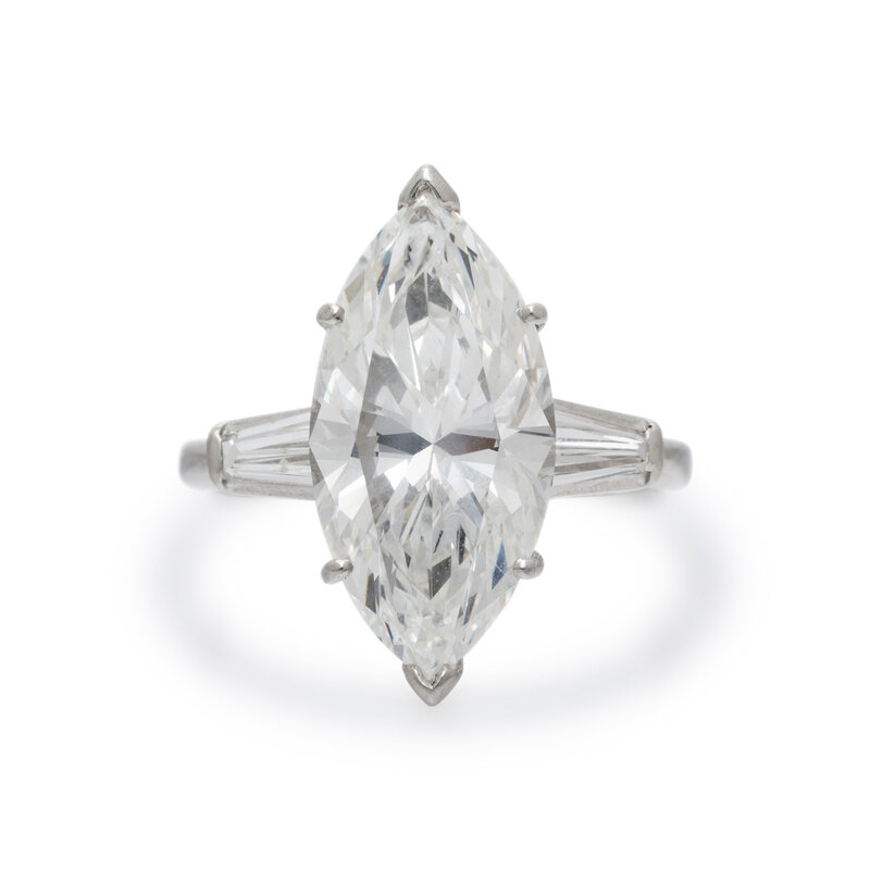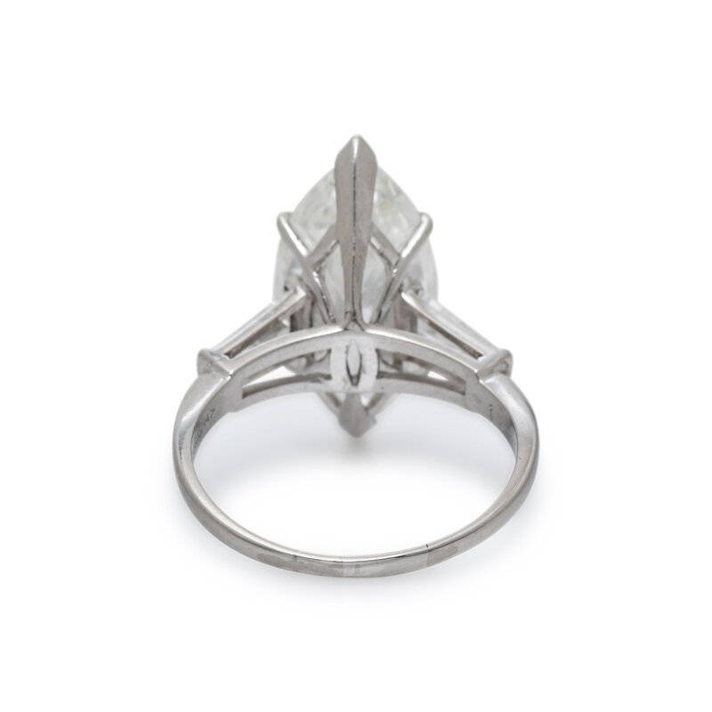 Featuring a marquise cut diamond weighing 6.79 carats, flanked by two tapered baguette cut diamonds weighing approximately 0.50 carat total. Mounted in platinum. Ring size 8 1/2.
