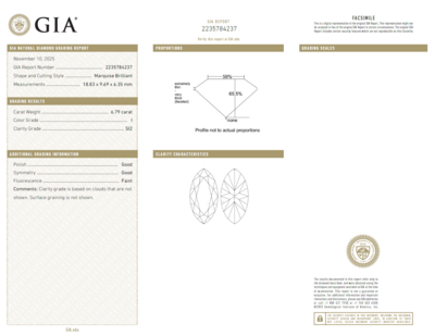 GIA, 2025, Report No. 2235784237, 6.79 carat, I color, SI2 clarity, Faint fluorescence