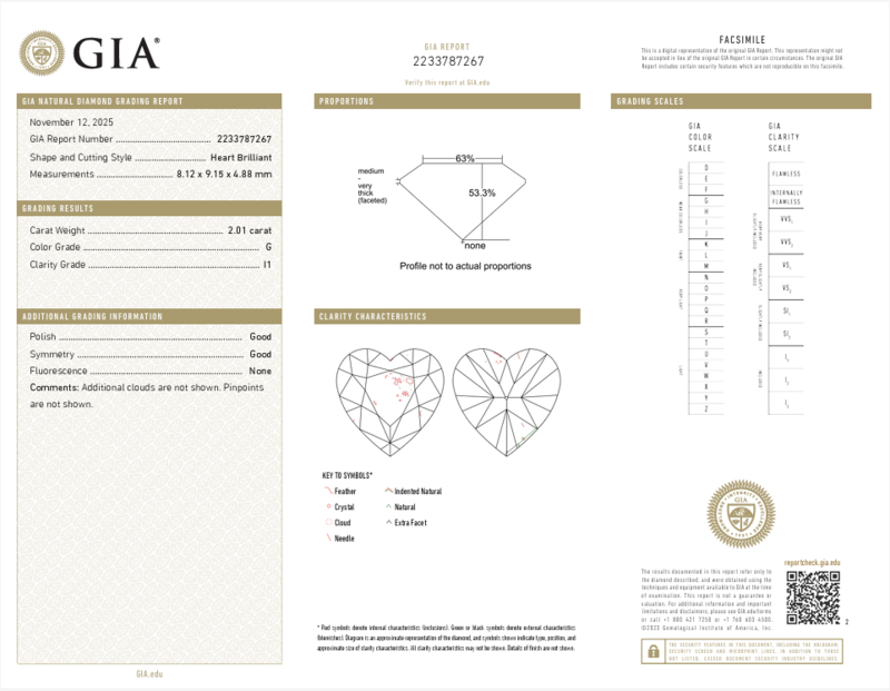 Center stone: GIA, 2025, Report No. 2233787267, 2.01 carats, G color, I1 clarity, No fluorescence