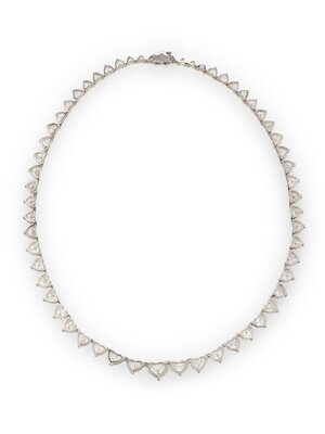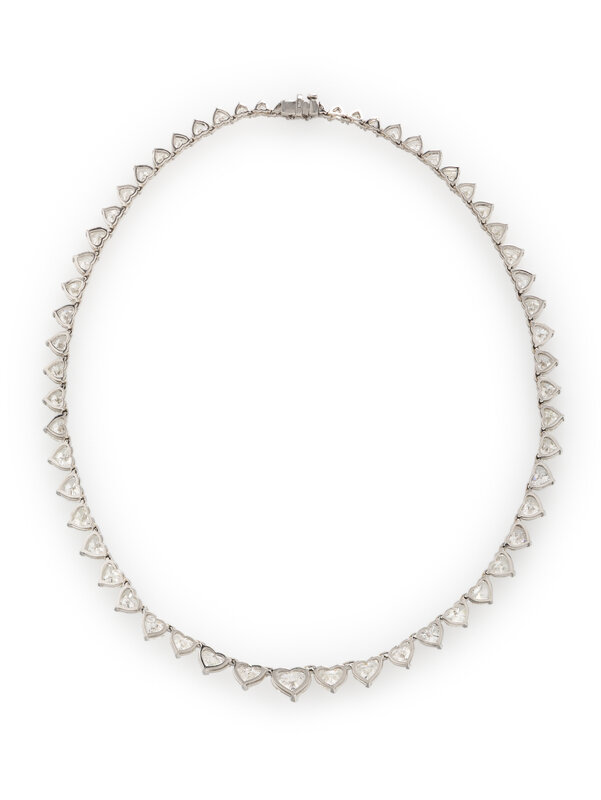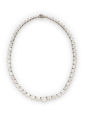 Featuring graduated heart shape diamonds weighing approximately 35.00 - 39.00 carats total, the center stone weighing 2.01 carats. Mounted in platinum. 15 1/2 inches long.