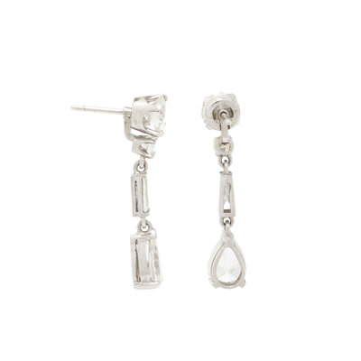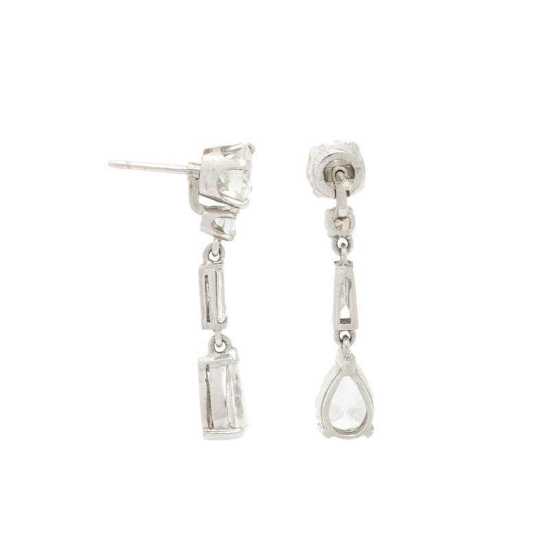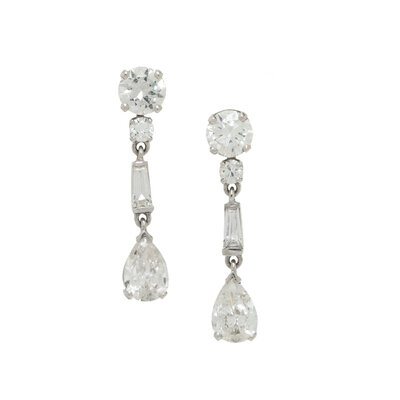 The studs set with round diamonds, weighing approximately 2.05 carats total, and the earring jackets set with round, tapered baguette cut, and pear shape diamonds weighing approximately 2.50 carats total. Mounted in platinum. 1 1/4 inches long.